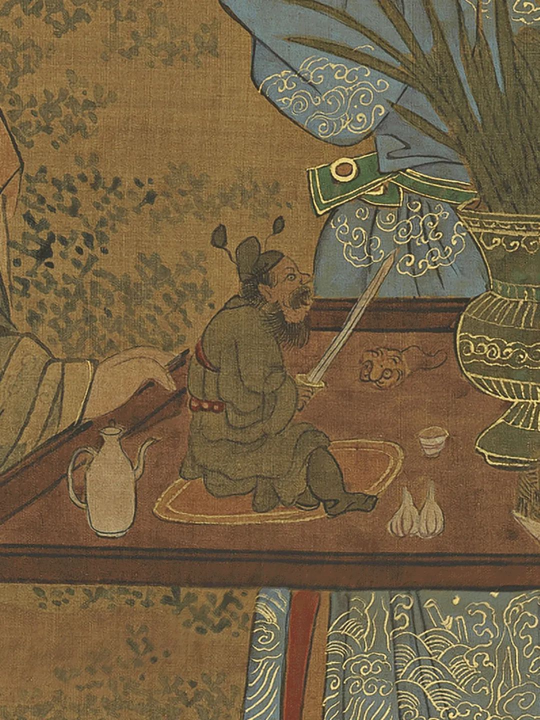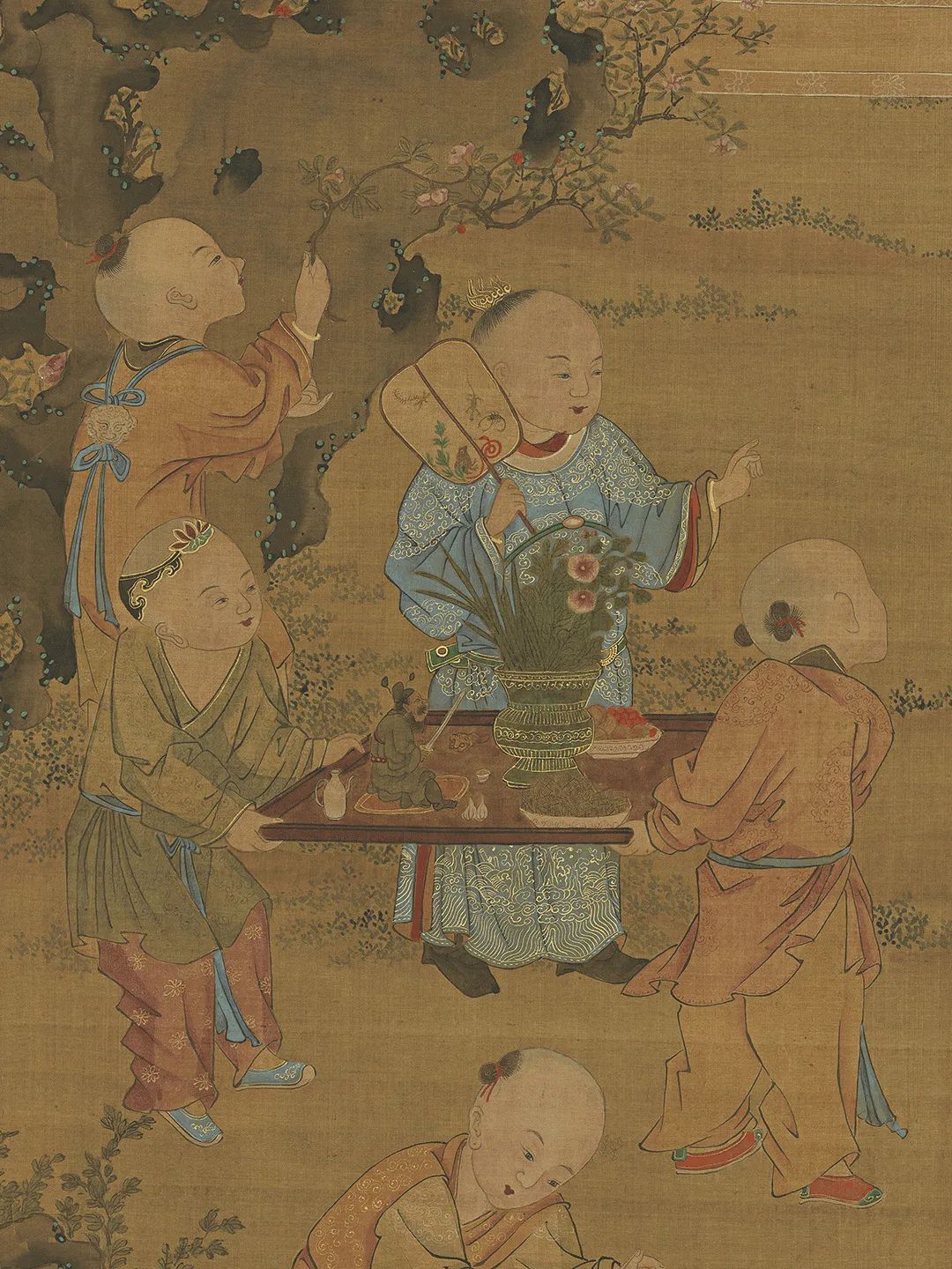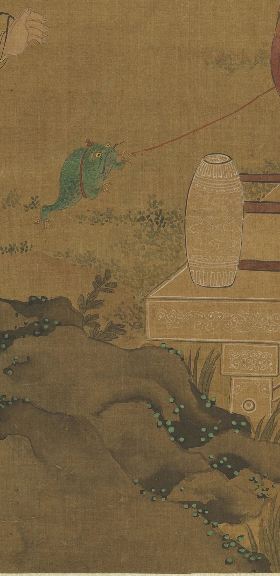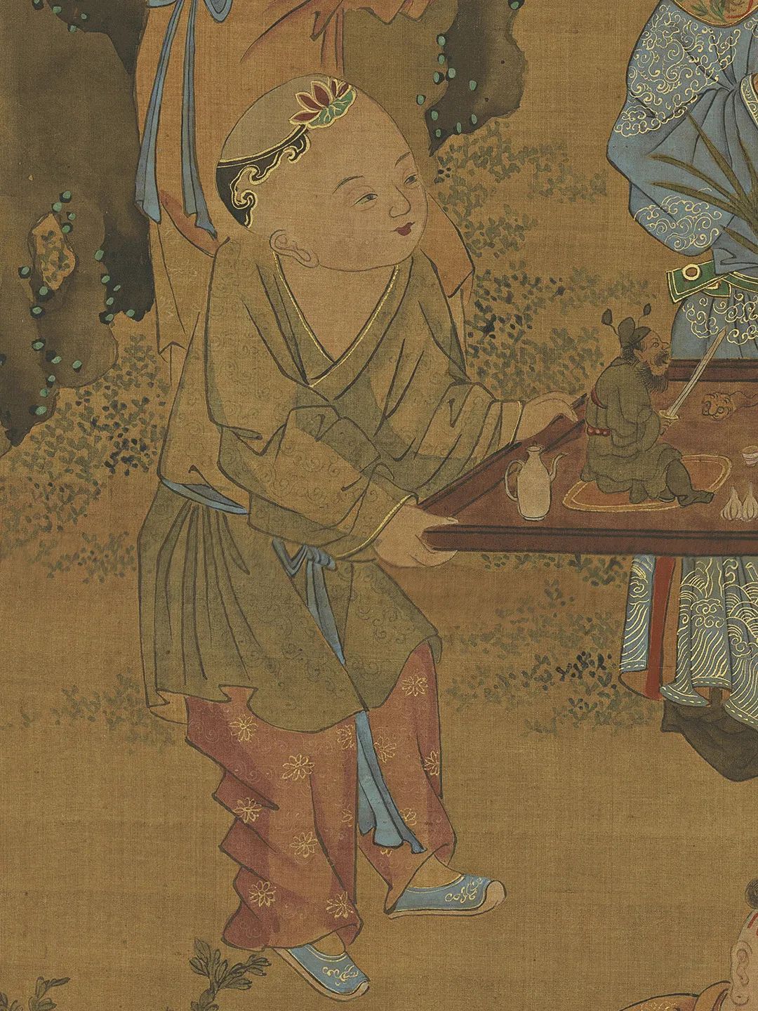 绘湖畔一带石栏,栏内的柳荫下有山石,傍着山石有一树榴花。石桥边两孺子戏蟾山石前一孺子擎荷,一孺子摇扇,宫扇上画着蛇、蝎、蜥蜴、蜈蚣、蟾蜍和艾叶,又有背上戴着虎头符牌的一个孺子手举榴花。两孺子抬案,案上一大盘角黍,一大盘樱桃生果,又酒注一,羽觞一,蒜头二,小虎儿一,又小小方圆毯,上有抓剑的钟馗。