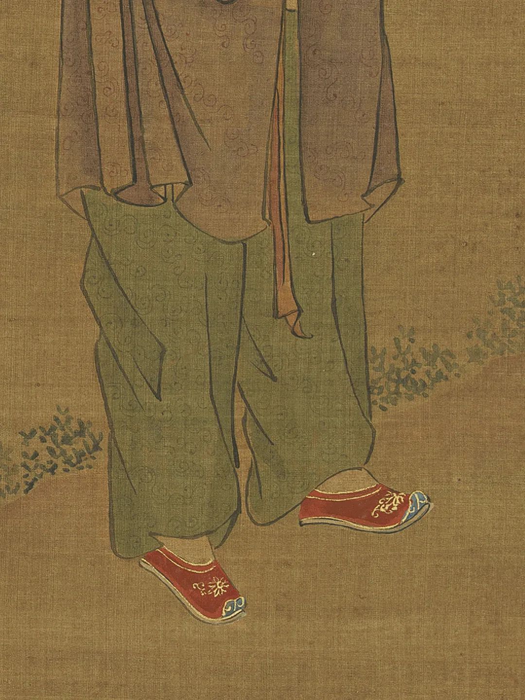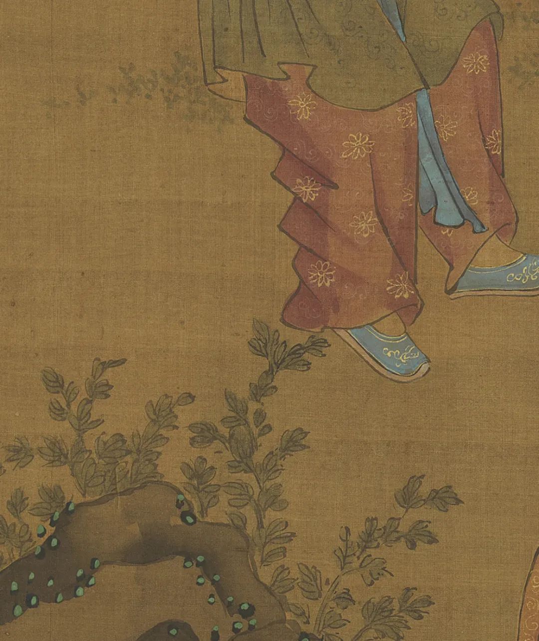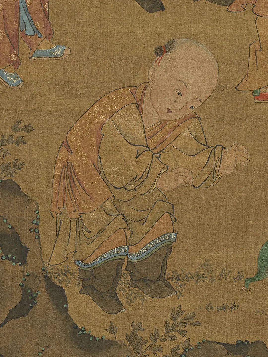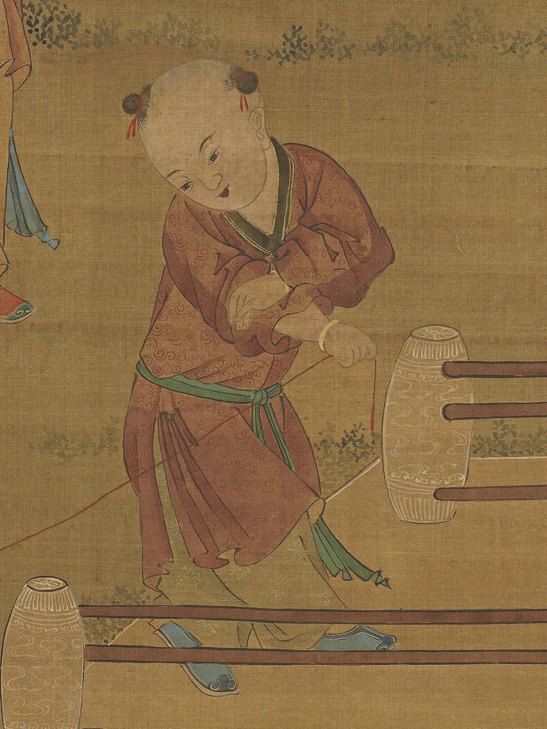绘湖畔一带石栏,栏内的柳荫下有山石,傍着山石有一树榴花。石桥边两孺子戏蟾山石前一孺子擎荷,一孺子摇扇,宫扇上画着蛇、蝎、蜥蜴、蜈蚣、蟾蜍和艾叶,又有背上戴着虎头符牌的一个孺子手举榴花。两孺子抬案,案上一大盘角黍,一大盘樱桃生果,又酒注一,羽觞一,蒜头二,小虎儿一,又小小方圆毯,上有抓剑的钟馗。