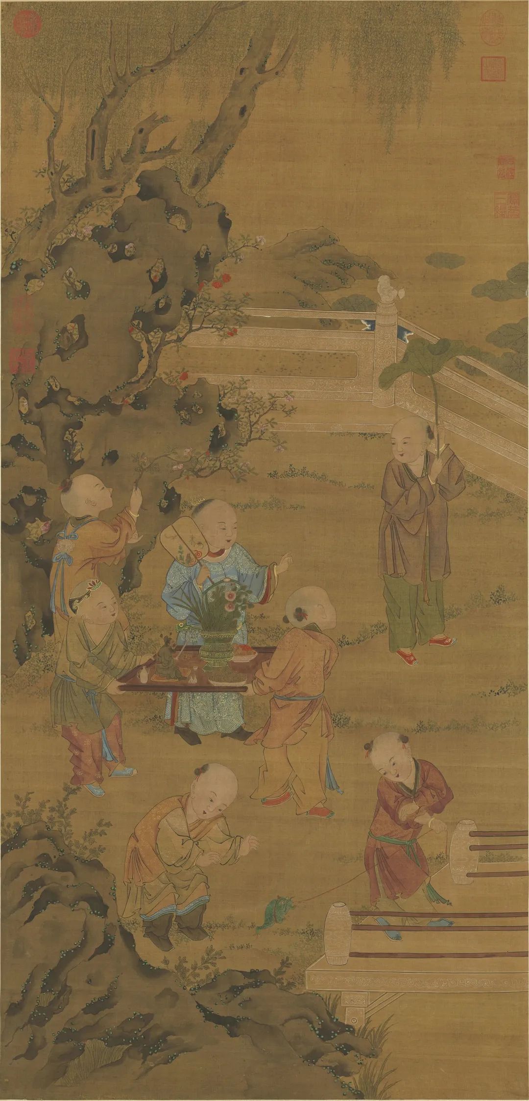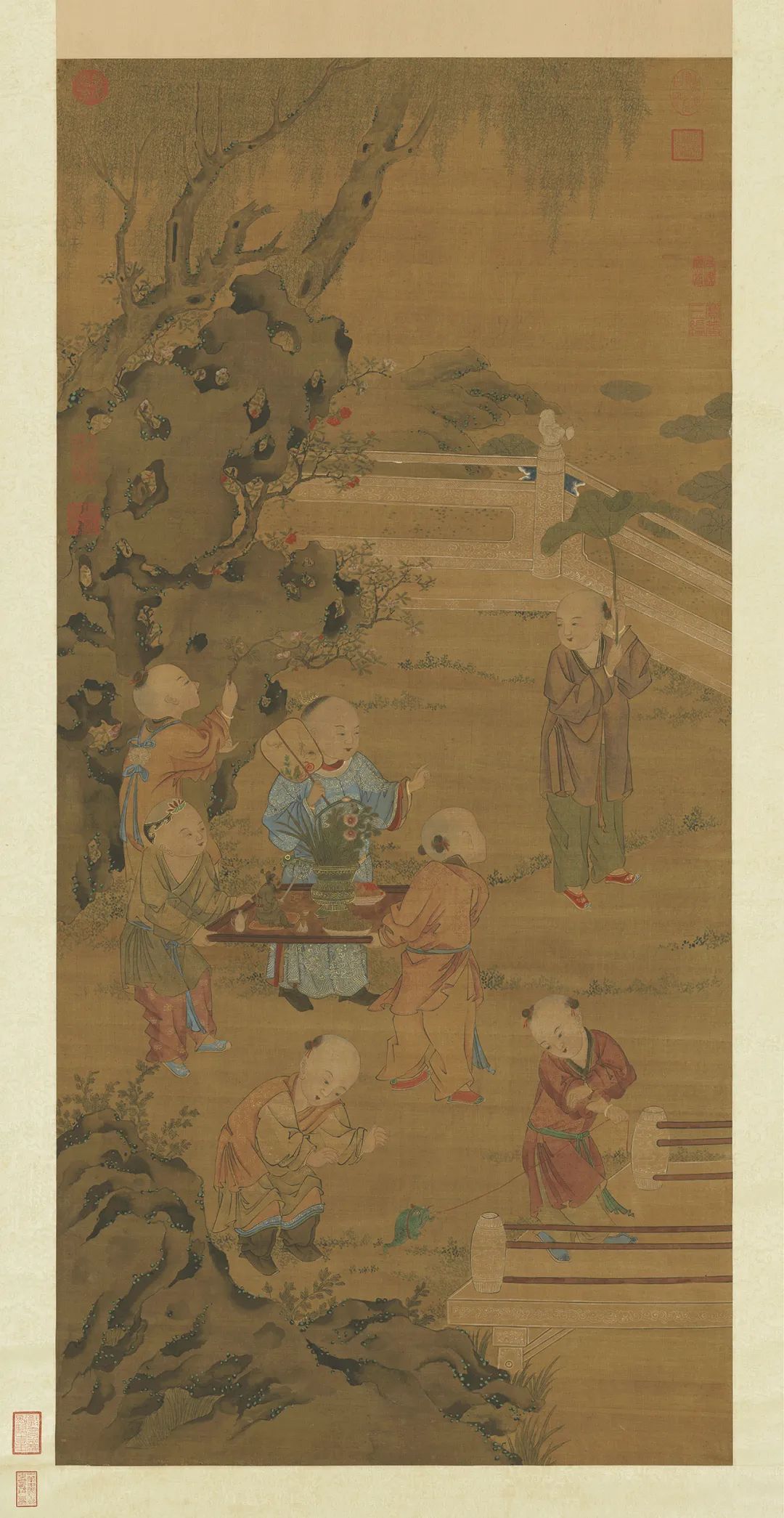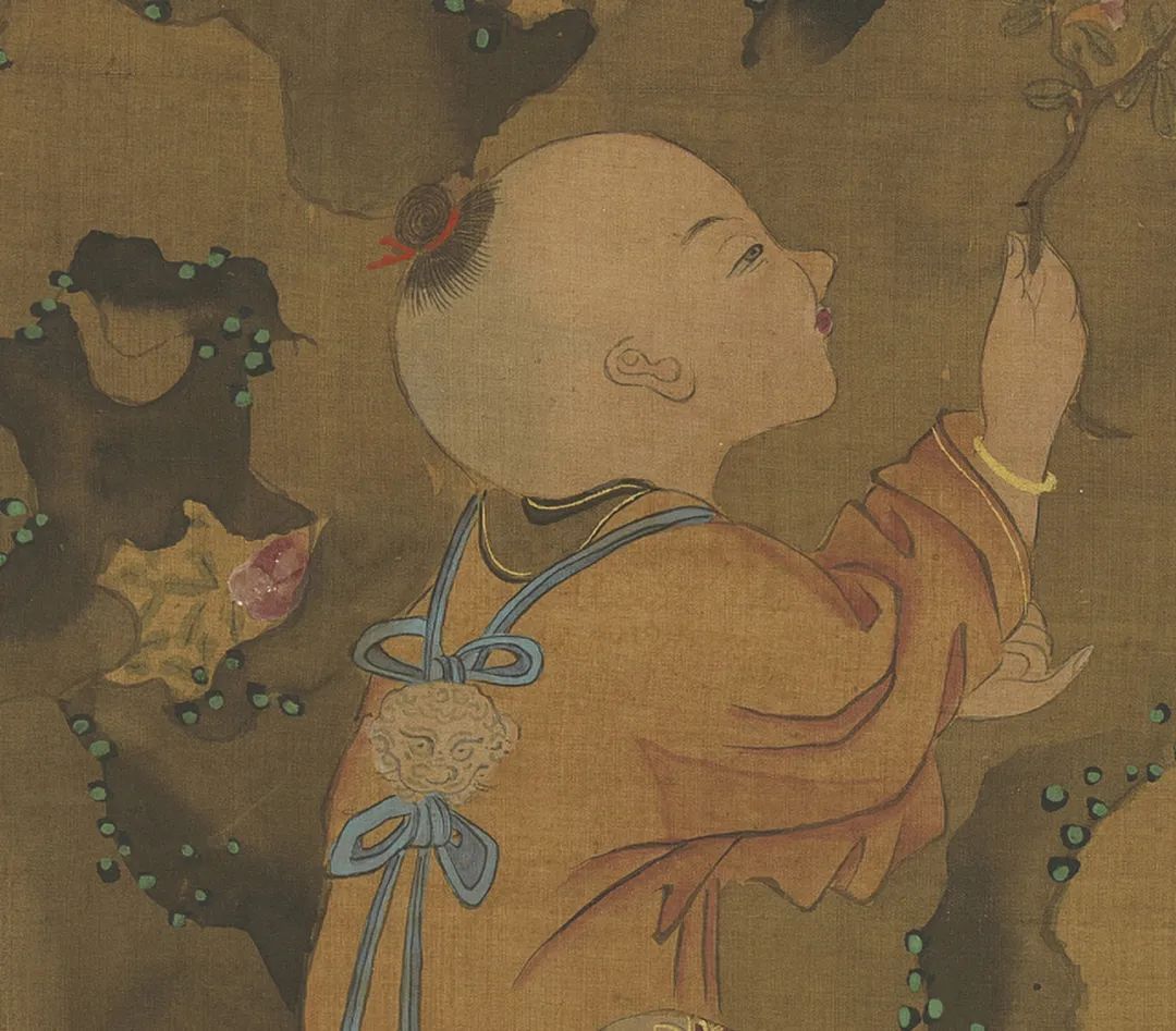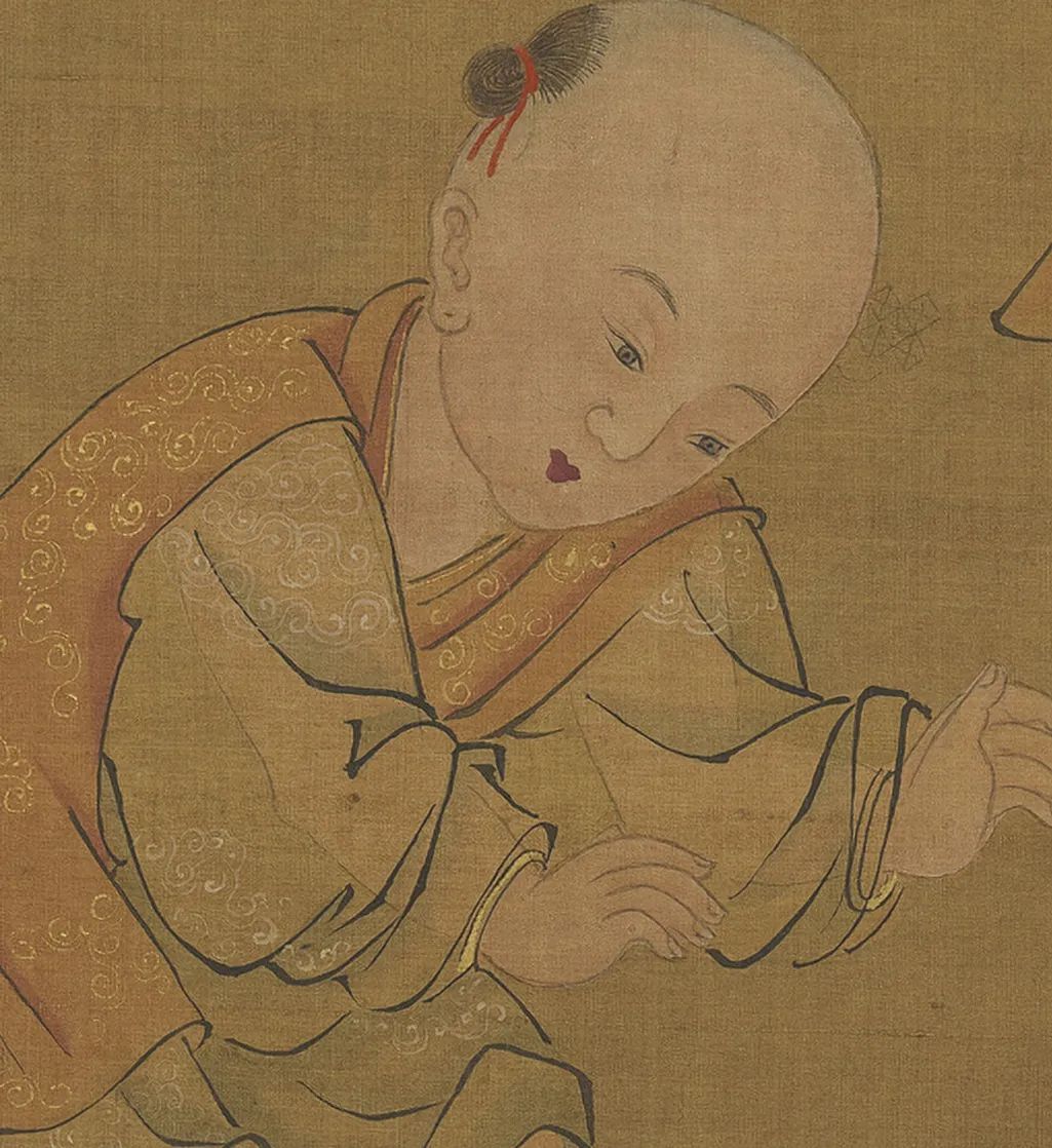 元东谈主绘《夏景戏婴图》,绢本设色,纵126.6厘米,横60.9厘米,现藏于台北故宫博物院。