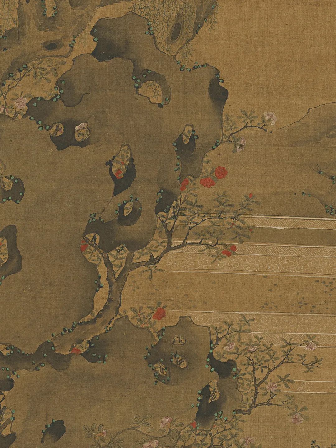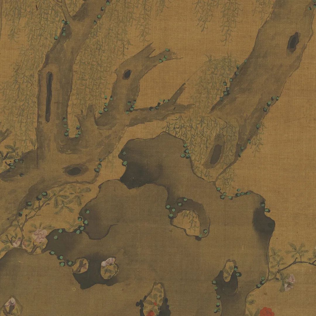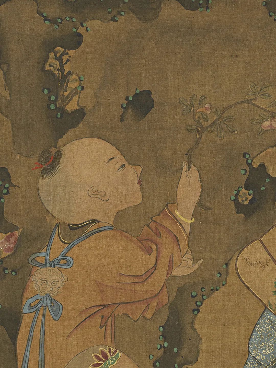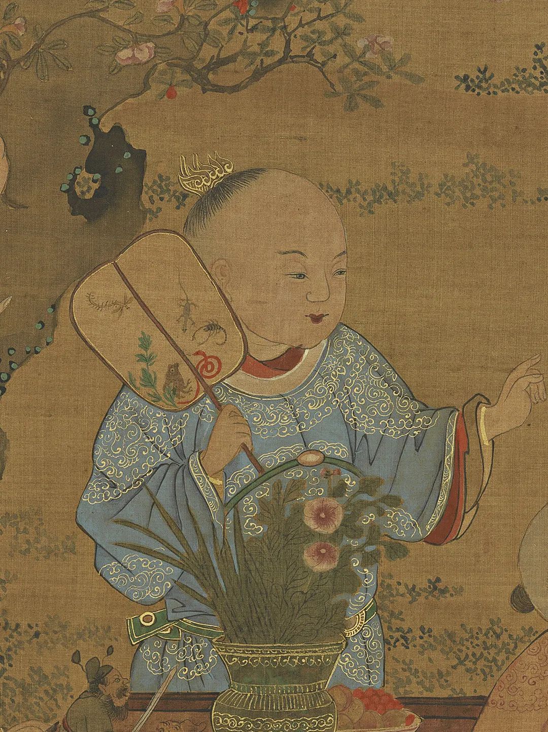元东谈主绘《夏景戏婴图》,绢本设色,纵126.6厘米,横60.9厘米,现藏于台北故宫博物院。