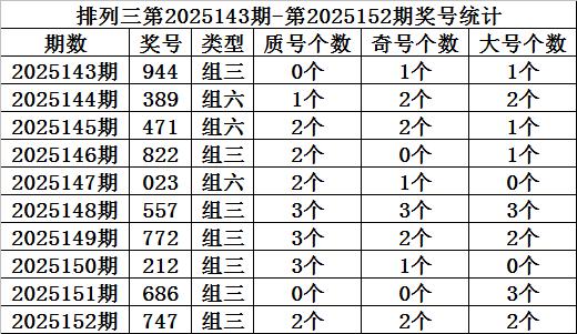 上期回来:罗列三第2025152期开奖:747,质合比为2:1,奇偶比为2:1,大小比为2:1。